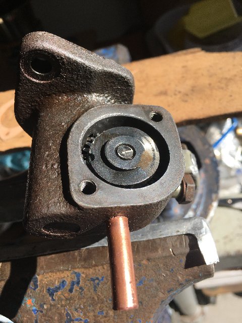 Ich montierte eine Wellendichtung und verschloss die beiden Durchführungen im Boden der Pumpe und platzierte eine externe Versorgungsanschluss. Es ist für mich auch klar, dass die Ölversorgung der Pumpe über dem Niveau der Pumpe liegen muss.